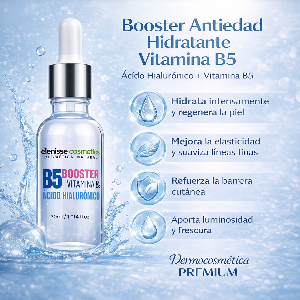 El Booster Antiedad Hidratante Vitamina B5 de Elenisse Cosmética Natural es un tratamiento facial concentrado formulado para hidratar profundamente, mejorar la elasticidad y reforzar la barrera cutánea, ayudando a mantener una piel más suave, firme y luminosa.