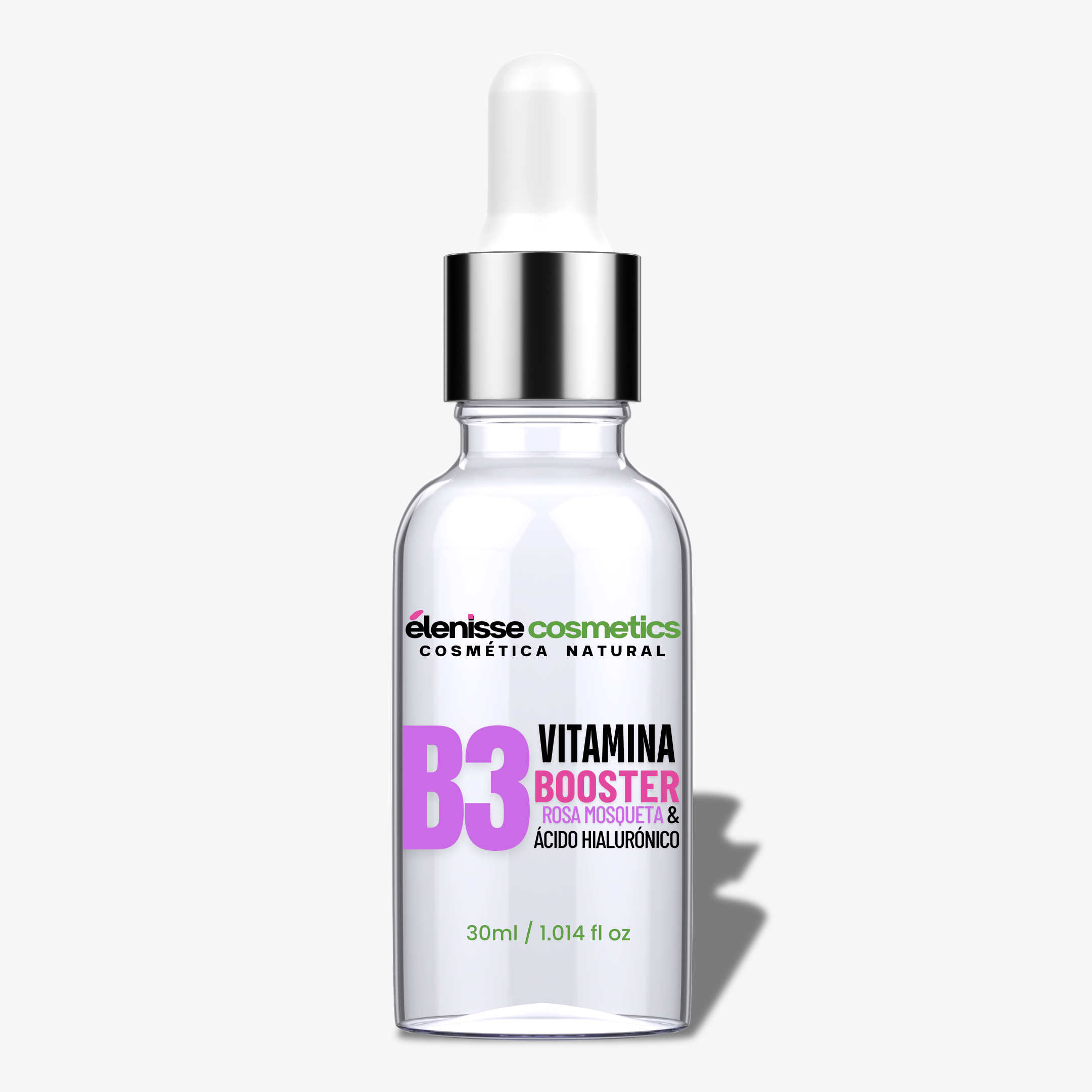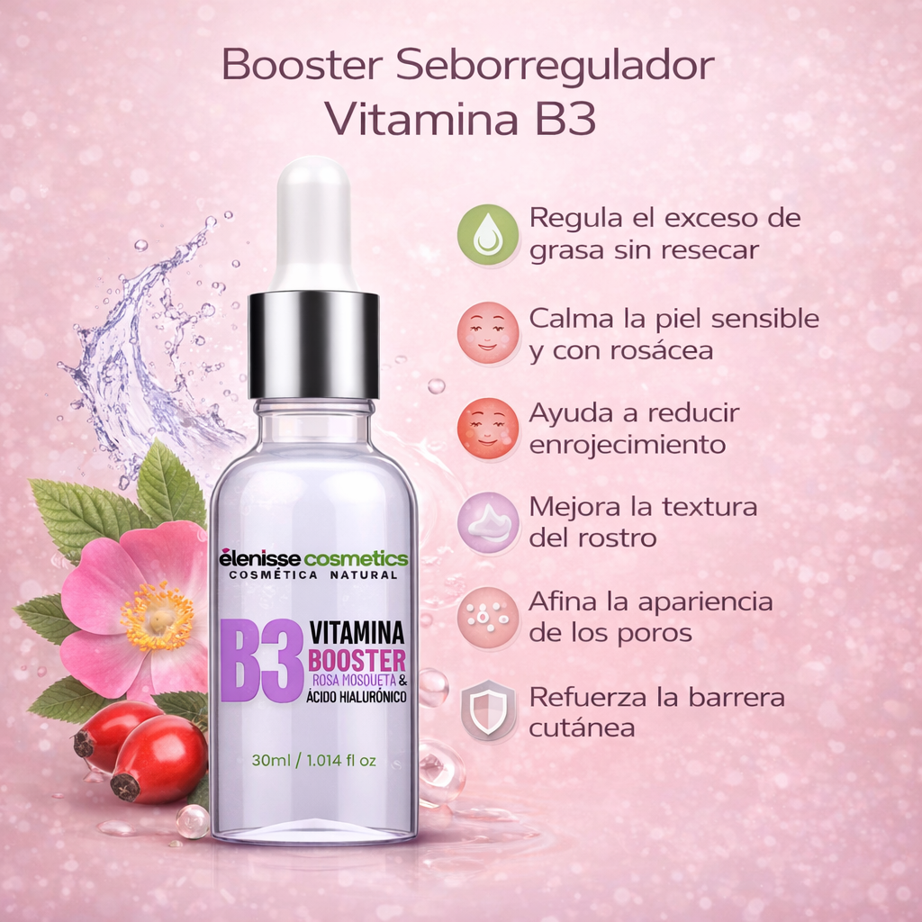 El Booster Seborregulador Vitamina B3 de Elenisse Cosmética Natural es un tratamiento facial equilibrante formulado para regular la producción de grasa, calmar la piel sensible y fortalecer la barrera cutánea. Su fórmula con niacinamida, ácido hialurónico y rosa mosqueta es ideal para pieles mixtas, grasas o con rosácea.